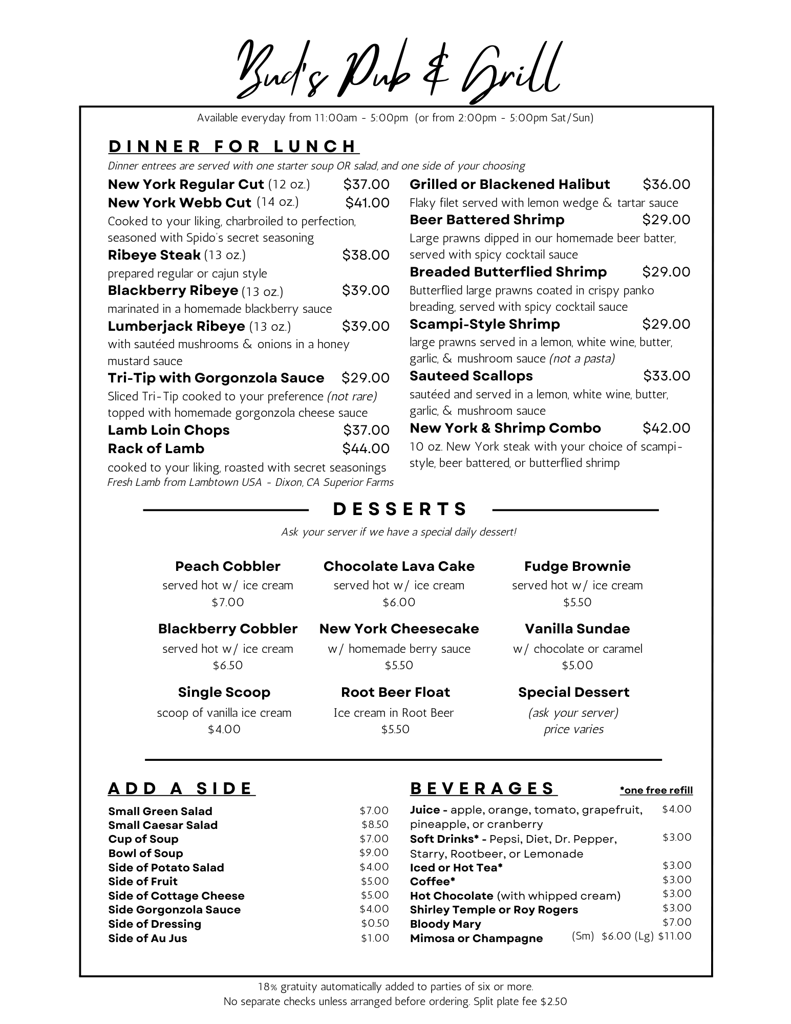 Fresh, home-cooked meals from sunrise to sunset. Start your morning with a hearty breakfast, or join us in the evening for our signature slow-roasted prime rib and exclusive daily specials. Be sure to time your visit to catch your favorite dishes!