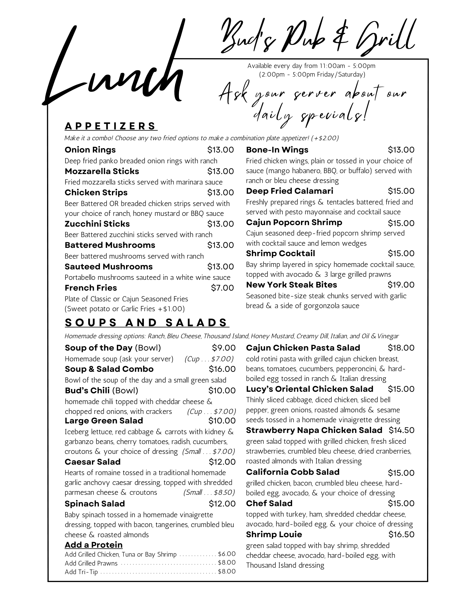 Come in or call for our rotating daily specials and homemade soups!